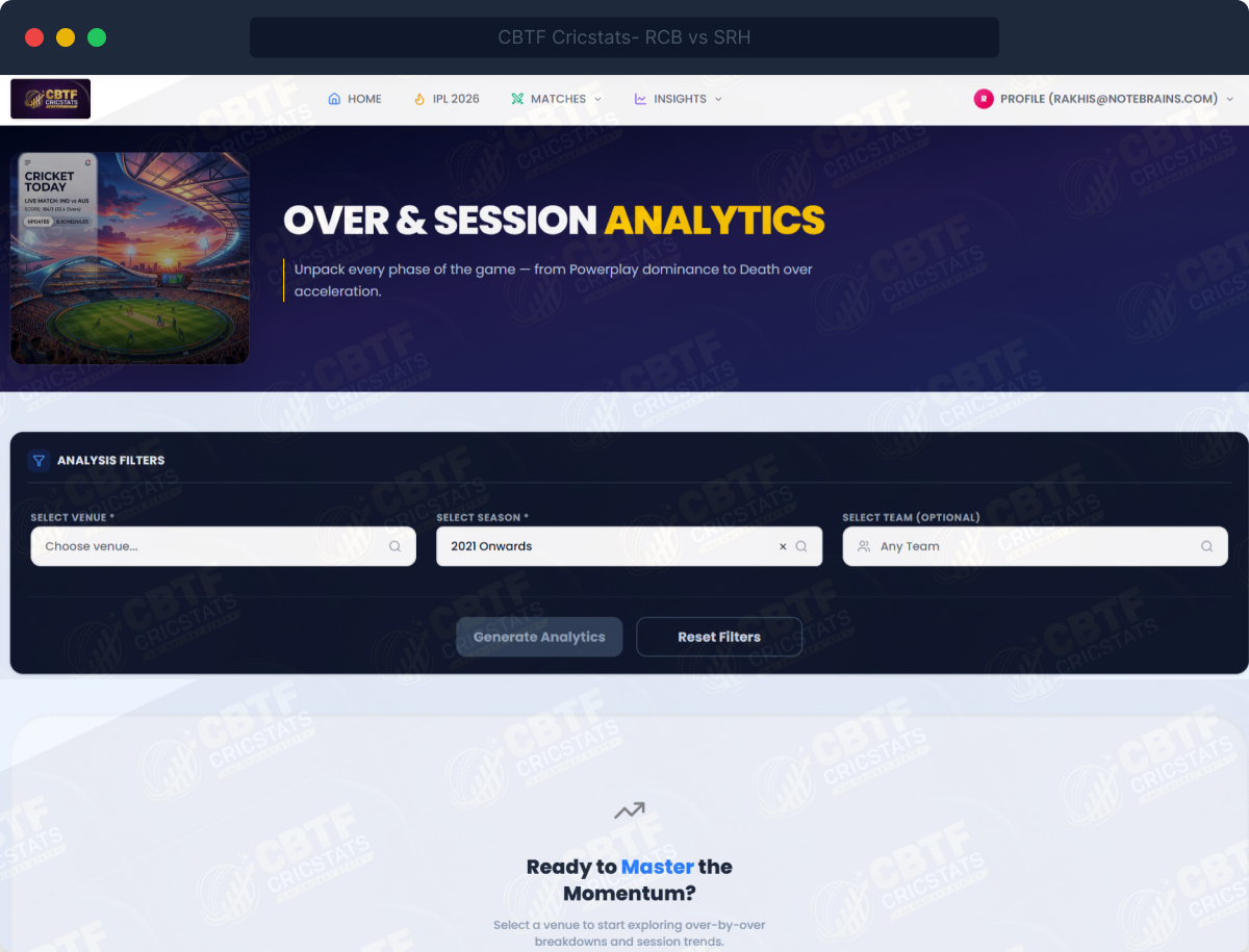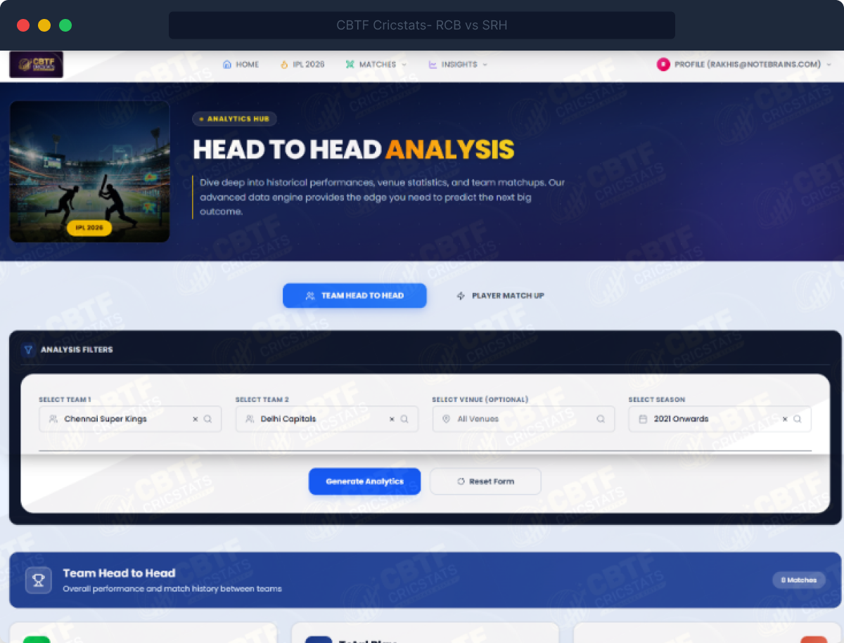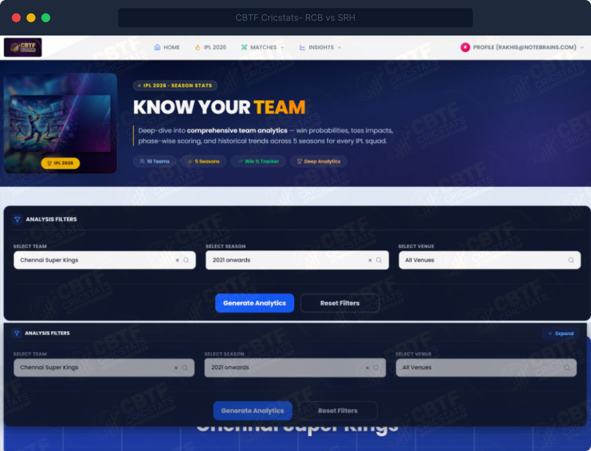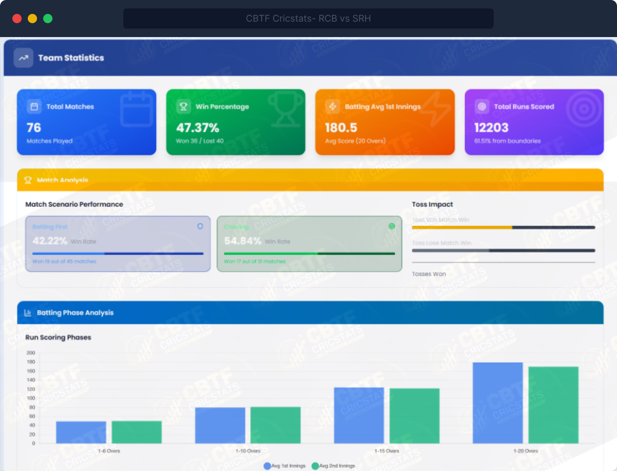 CBTF CricStats builds a full analytical profile for every IPL team — how they perform batting first vs chasing, how their run rate changes over-by-over, how their bowling performs in each phase, and how they fare against each specific opposition.