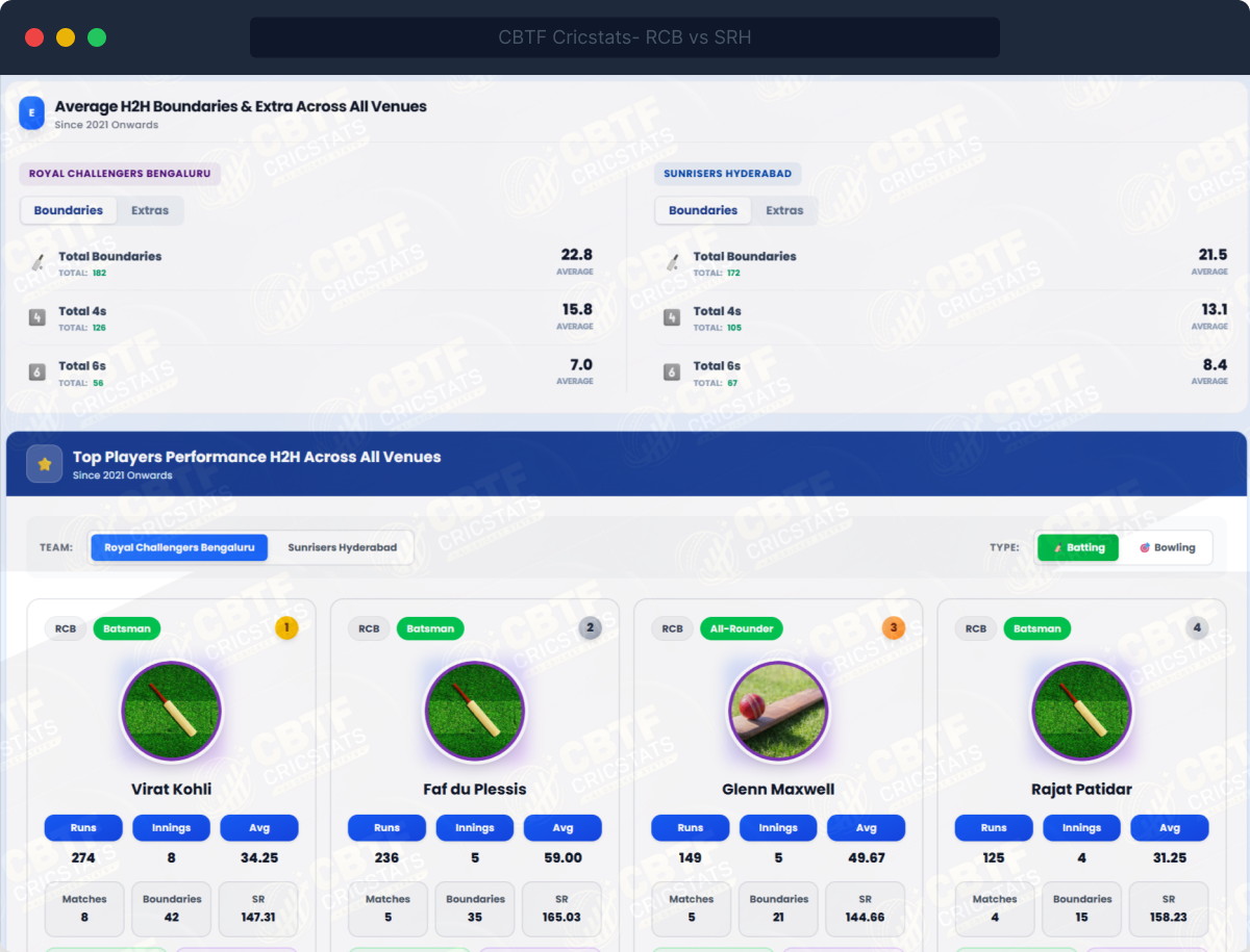 - Player batting cards — runs, average, SR, boundaries for both XIs in H2H