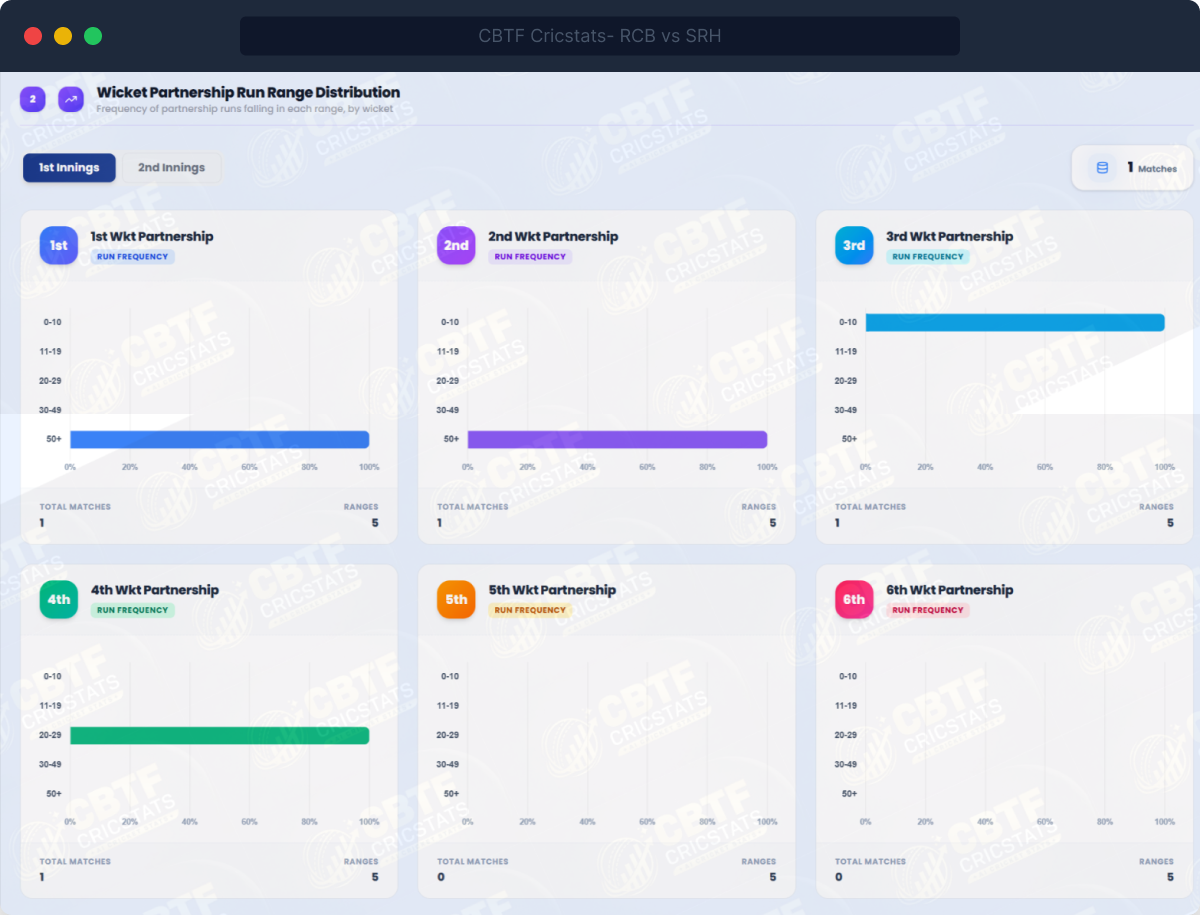- Drill-down per wicket: run range distribution (0–10, 11–19, 20–29, 30–49, 50+)