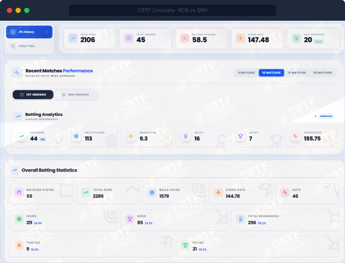 - Recent performance with 5/10/15/25 match toggles and 1st vs 2nd innings split