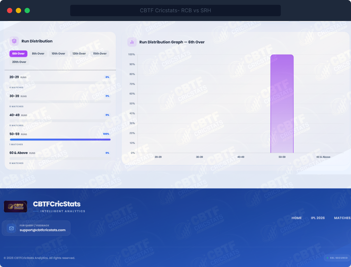 The Session module answers the single most important in-match question: is this innings on track? We give you the cumulative average score at every over from 1 to 20, plus a detailed run range distribution at each key milestone over.