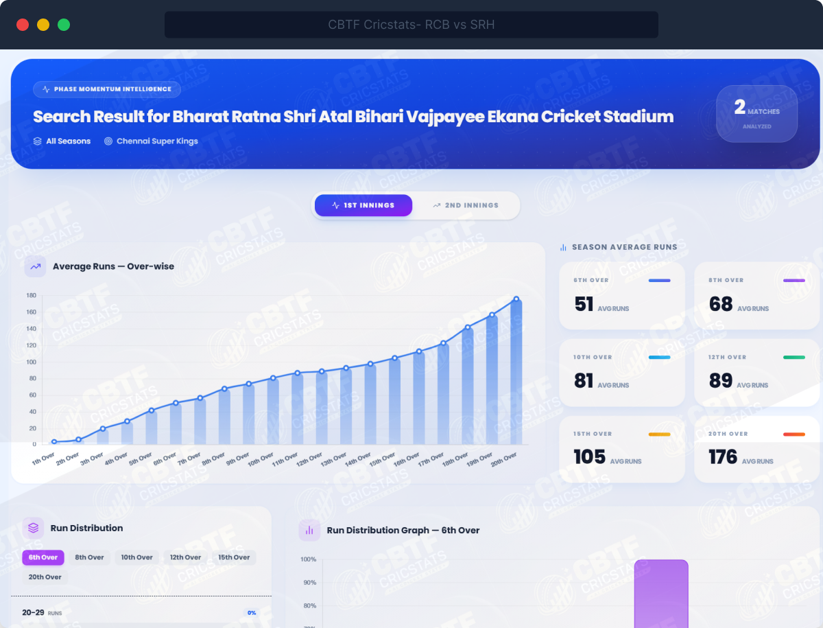When a team is 68/2 after 10 overs and the 10-over average here is 84, you know — instantly, without calculation — that they are 16 runs behind par. That is the decision-support capability this module delivers.