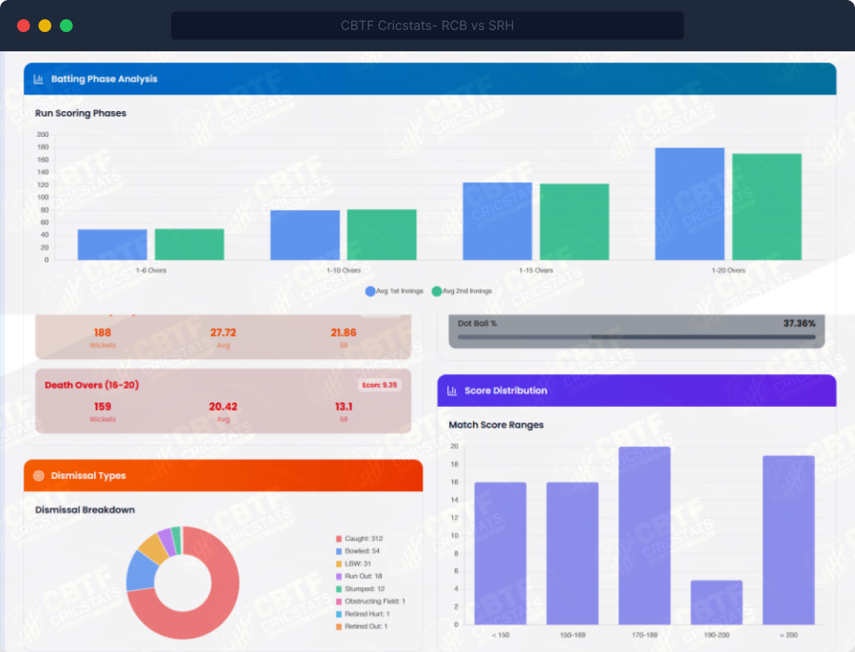 Beyond the averages lies the full analytical portrait of a ground — how scoring patterns evolve over-by-over, where boundaries cluster, how pace and spin compare, how chasing teams perform at different target ranges, and which dismissal types dominate.