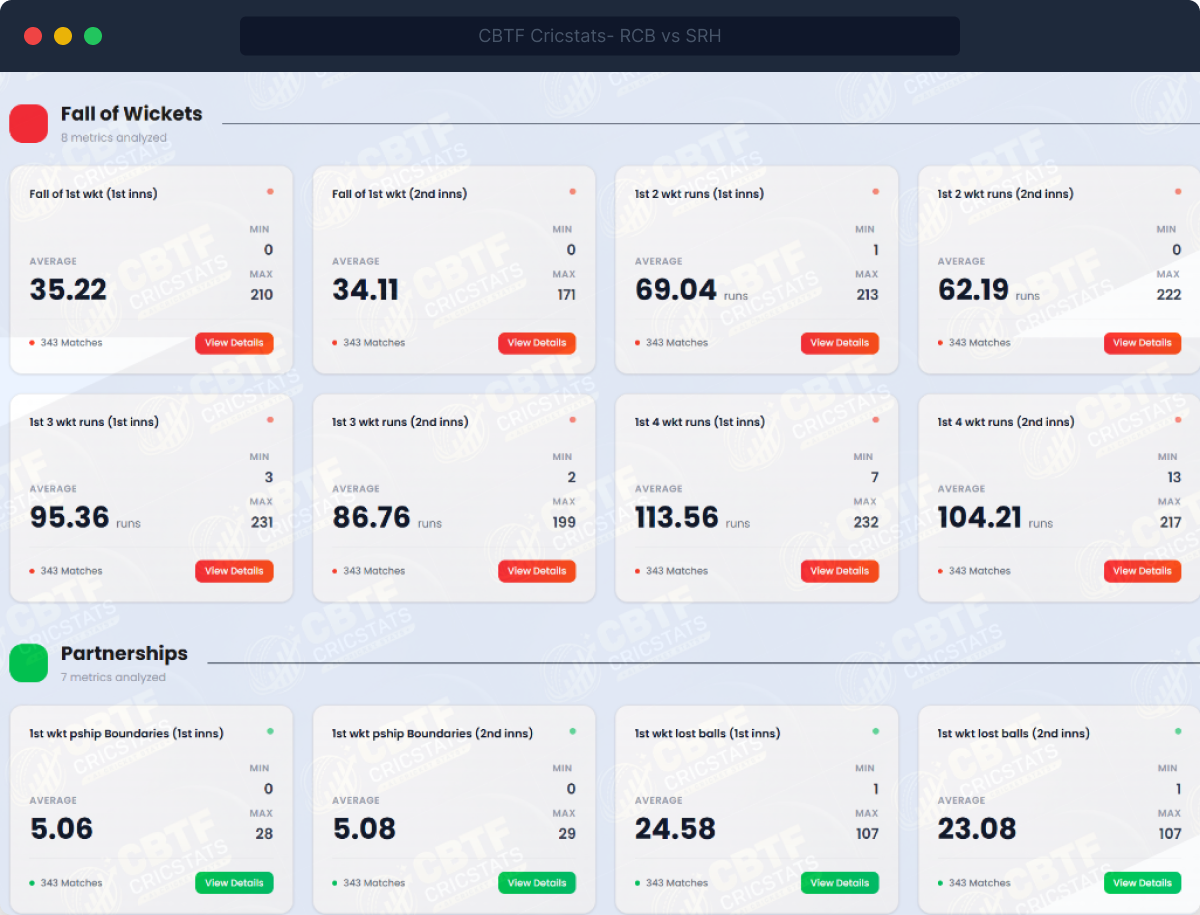 This is the most comprehensive venue intelligence system in cricket. Seven stat categories — Opening Stats, Fall of Wickets, Partnerships, Match Totals, Player Counts, Batting Distributions, and Others — each broken down across 21+ matches with average, minimum, and maximum values.