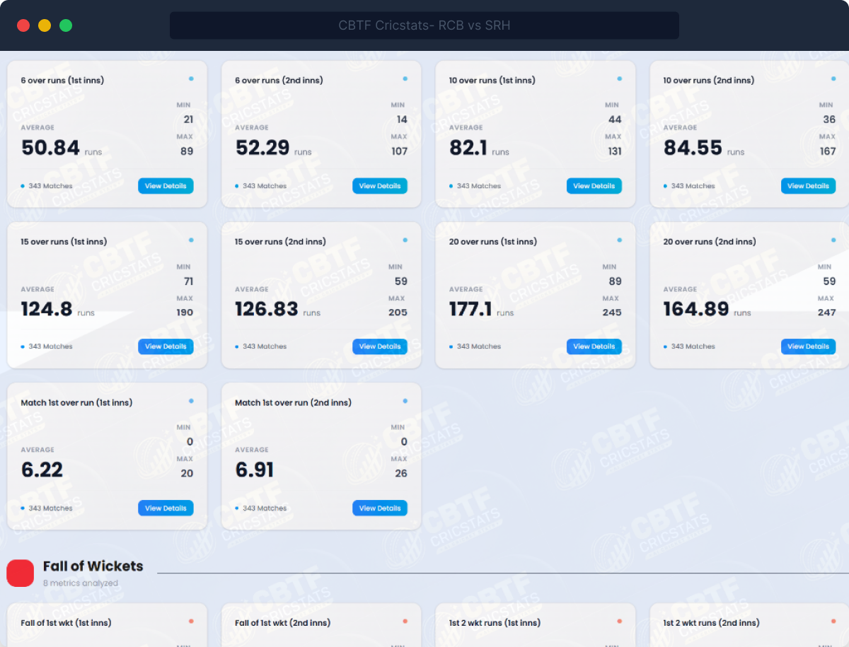 - Opening Stats: 6-over and 10-over runs for both innings with full range